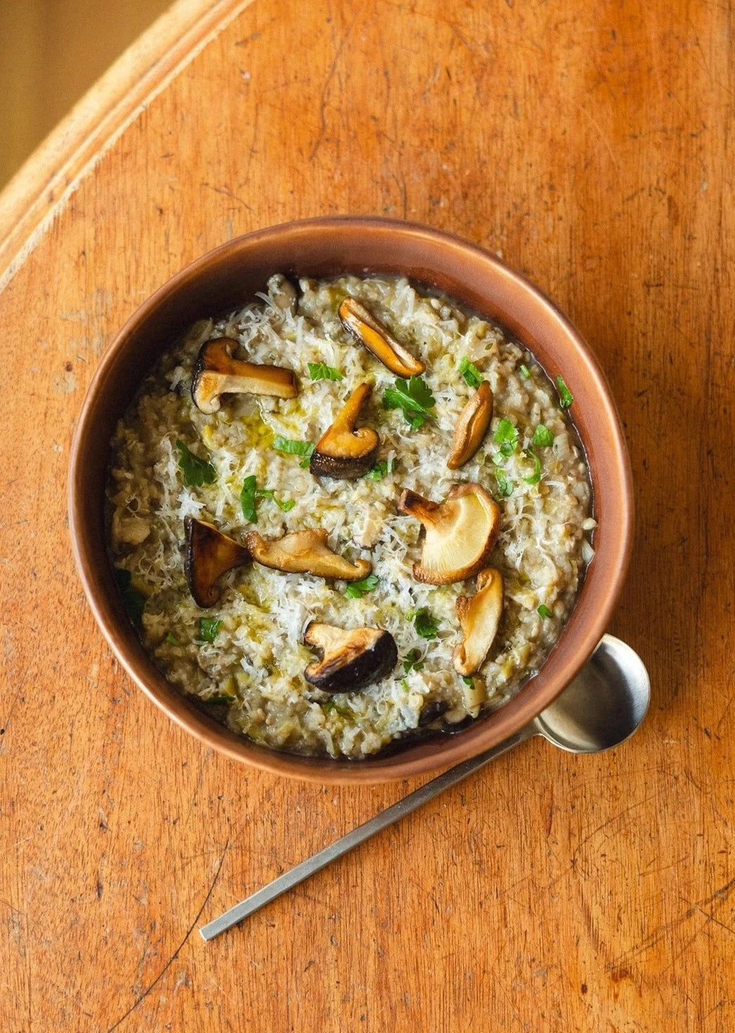 buckwheat and arborio risotto cooked in a porcini-infused bone broth with fresh shiitake mushrooms sautéed in thyme and butter.
