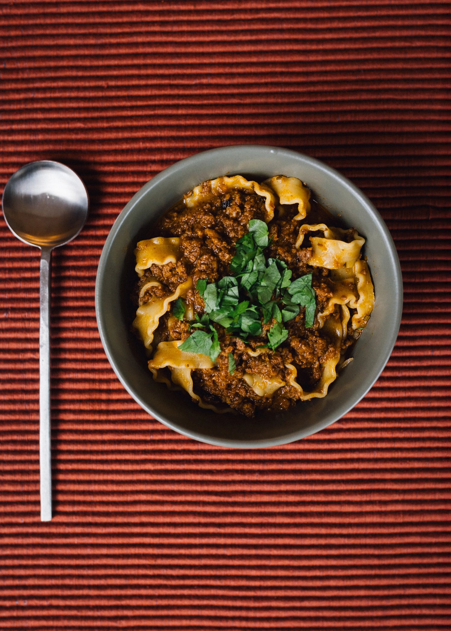 slow-cooked beef ragu in a rich tomato sauce infused with subtle fennel and cumin spices.