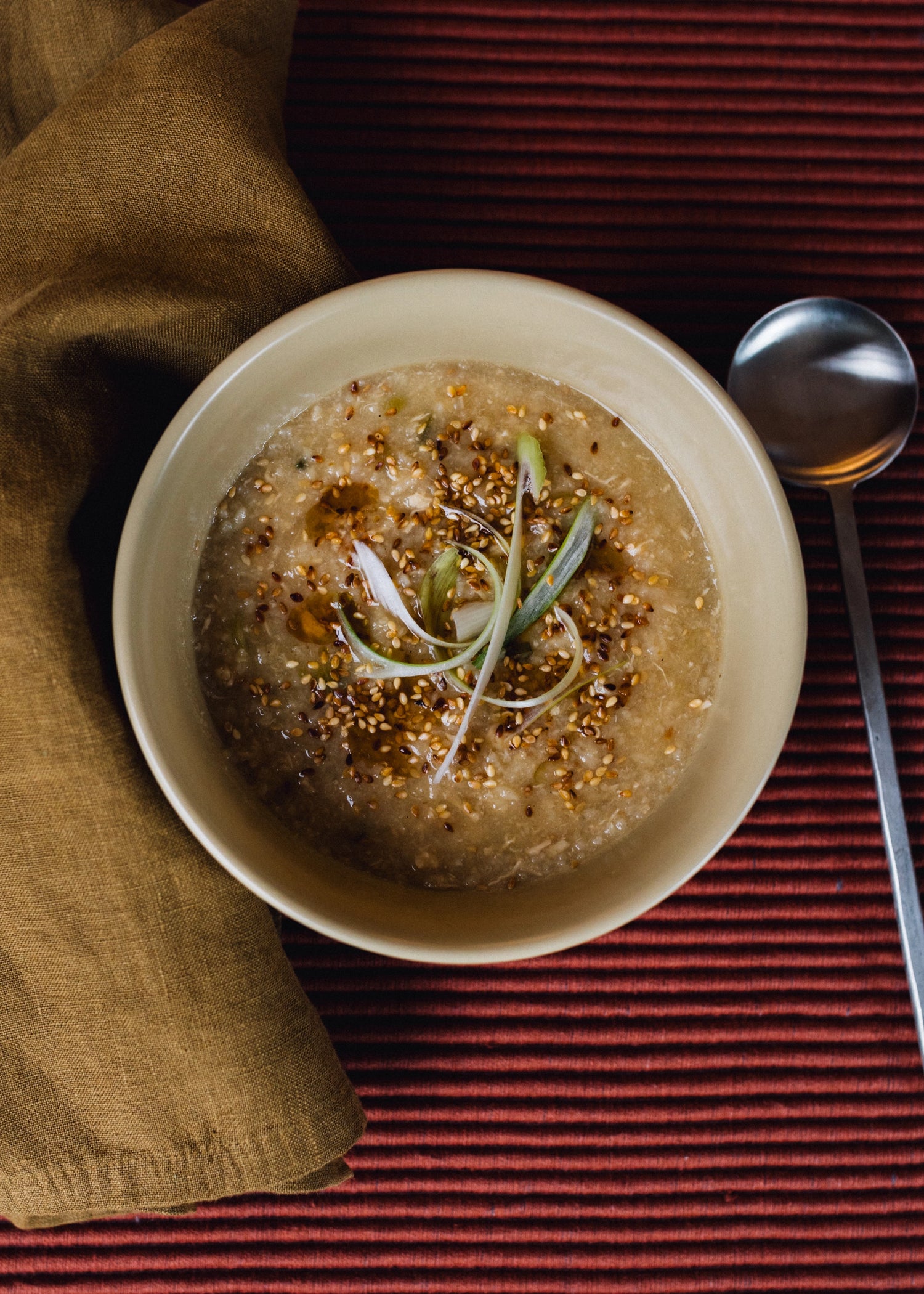 basmati rice is soaked overnight and then cooked in bone broth to make a warming savoury rice porridge.